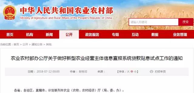 為加快推進(jìn)新型農(nóng)業(yè)經(jīng)營(yíng)主體信息直報(bào)系統(tǒng)(以下簡(jiǎn)稱(chēng)直報(bào)系統(tǒng))應(yīng)用實(shí)施,幫助緩解新型農(nóng)業(yè)經(jīng)營(yíng)主體貸款難、貸款貴問(wèn)題,我部將以直報(bào)系統(tǒng)為載體開(kāi)展貸款貼息試點(diǎn)?,F(xiàn)將有關(guān)事宜通知如下。
