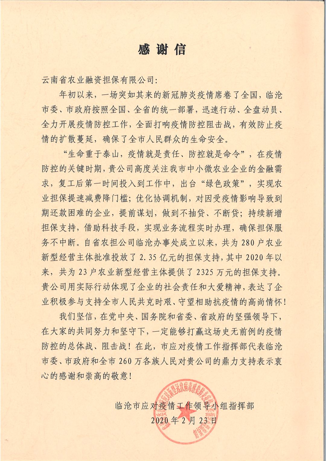 2月23日,臨滄市應(yīng)對(duì)疫情工作領(lǐng)導(dǎo)小組指揮部向云南農(nóng)擔(dān)公司發(fā)來致函,對(duì)在新冠肺炎疫情期間,公司積極履行職責(zé),為臨滄市新型農(nóng)業(yè)經(jīng)營主體融資需求紓困,表示由衷感謝。今年以來,公司為臨滄市23戶農(nóng)業(yè)新型經(jīng)營主體提供了2325萬的擔(dān)保支持,并在疫情期間出臺(tái)“綠色”政策,積極扶持新型農(nóng)業(yè)經(jīng)營主體共渡難關(guān)。