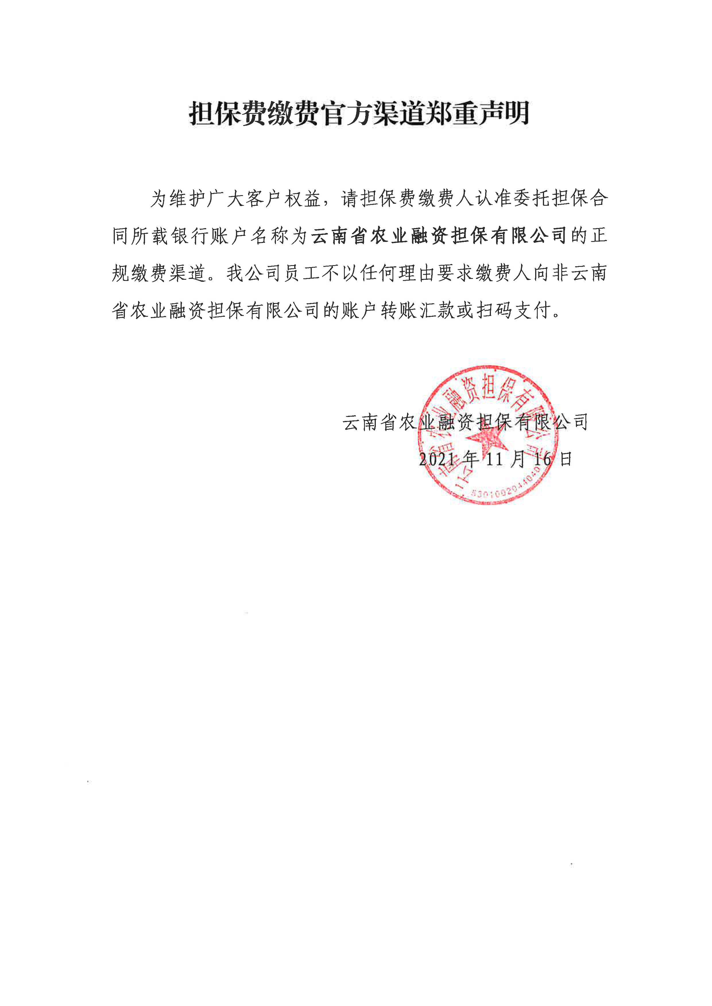 云南省農(nóng)擔公司擔保費繳費官方渠道鄭重聲明